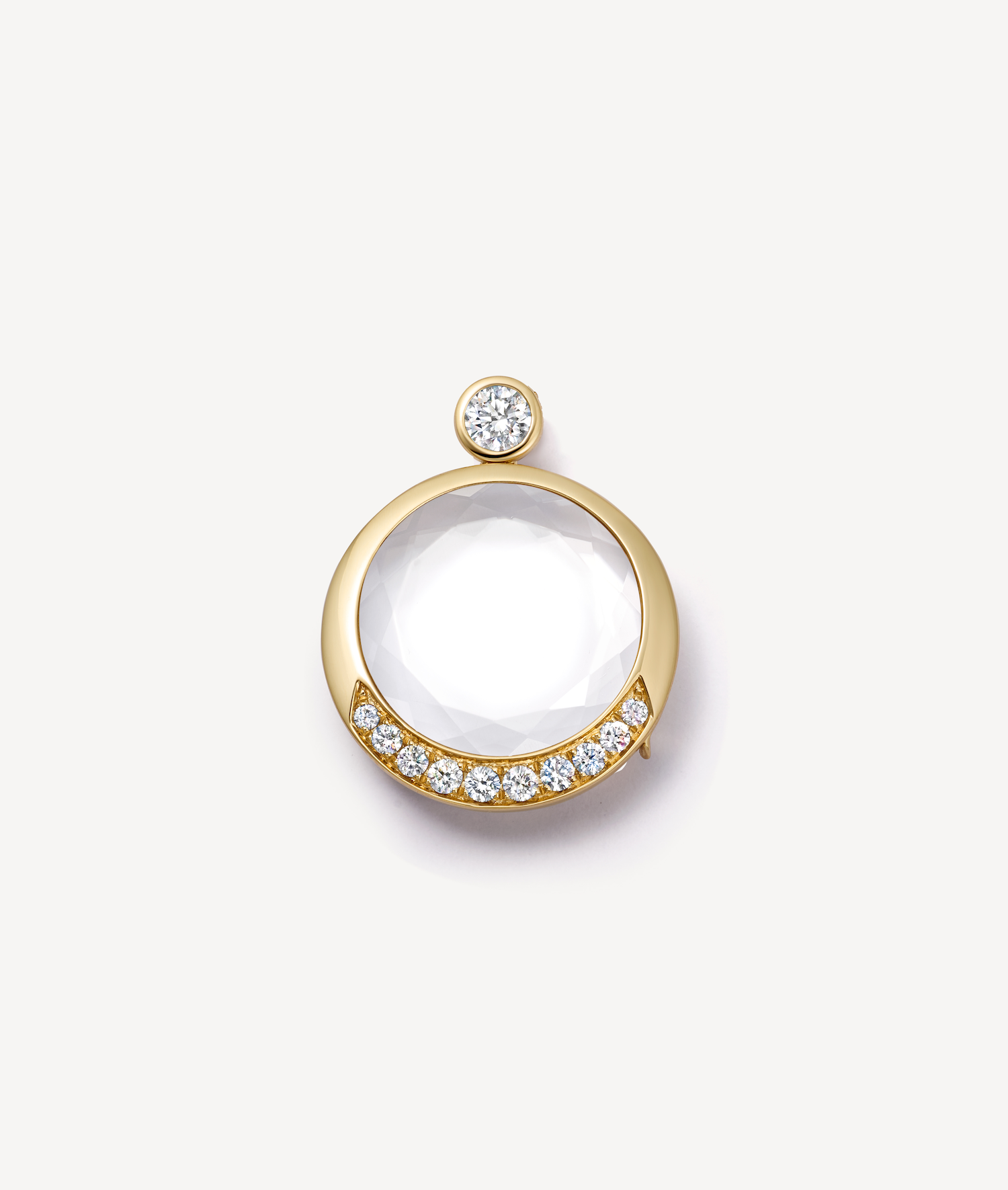 Diamond rim round locket pendant in yellow gold and diamond bail with faceted crystal facade.
