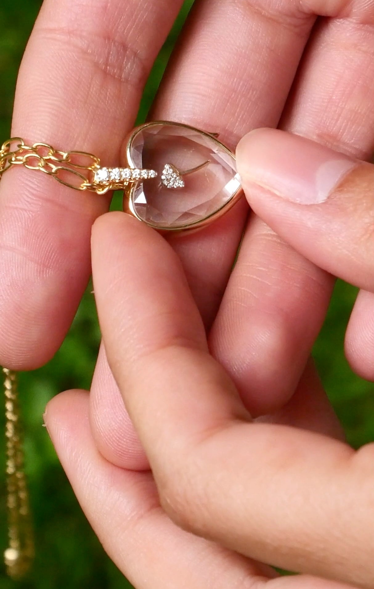 At the heart of her look is her Amate locket in yellow gold and diamonds, holding three charms that represent her most profound connections.