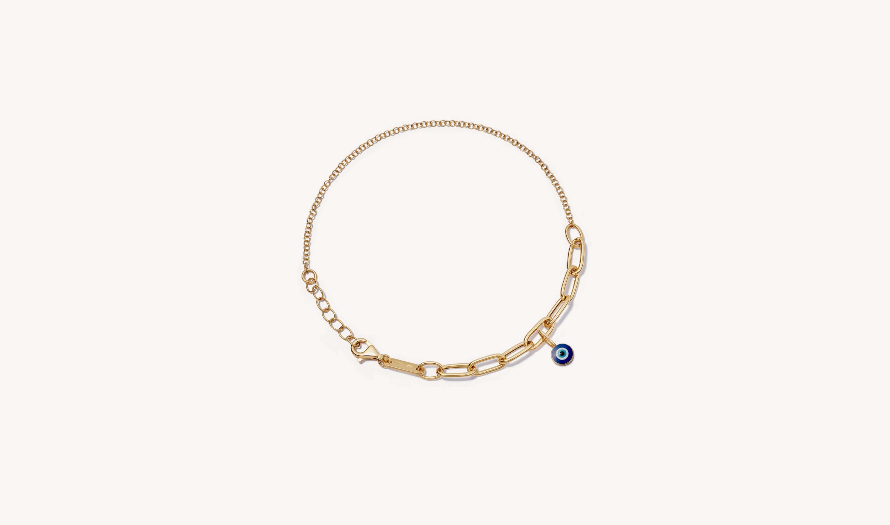 A symbol of strength, clarity, and protection. Handcrafted in 14k solid gold, our Evil Eye Charm bracelet is a centuries-old emblem of resilience and inner focus. Its perfectly round form is filled with vivid blue, white, and turquoise enamel, a guardian against negativity and a reminder to trust your path.