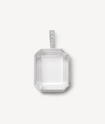 Where style meets timeless elegance, our personalised Baguette locket, masterfully crafted in 18k solid white gold with pavé diamond bail, becomes an extension of who you are. Designed to hold your most meaningful moments, it weaves effortlessly into your life, worn with intention, layered with sophistication, or treasured as your signature piece. It grows more precious with every chosen charm, whilst our signature clasp ensures secure protection, and the faceted crystal lets your personal story shine with brilliance.