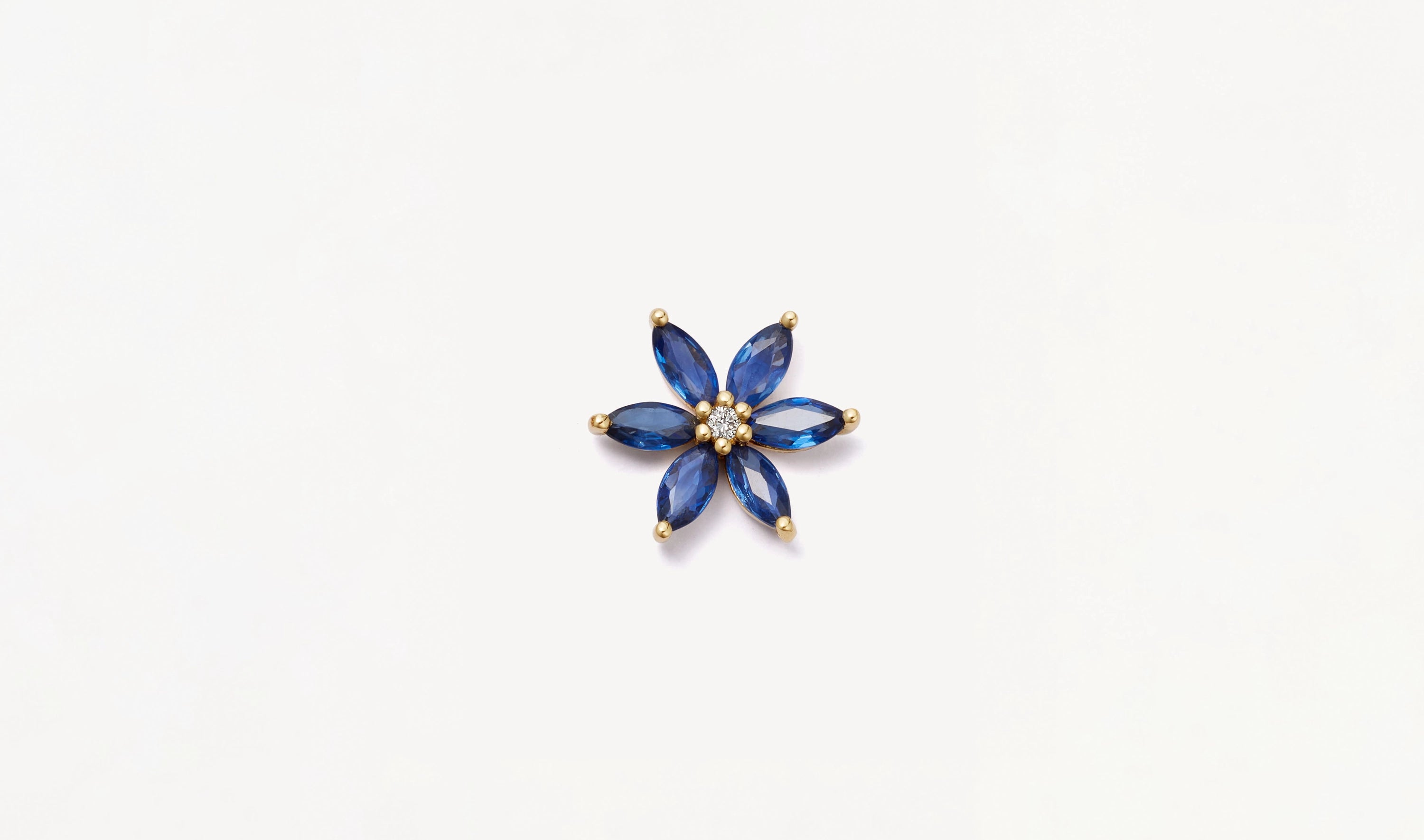 Crafted in 18k solid gold, set with six marquise-cut blue sapphires, a round VVS diamond.