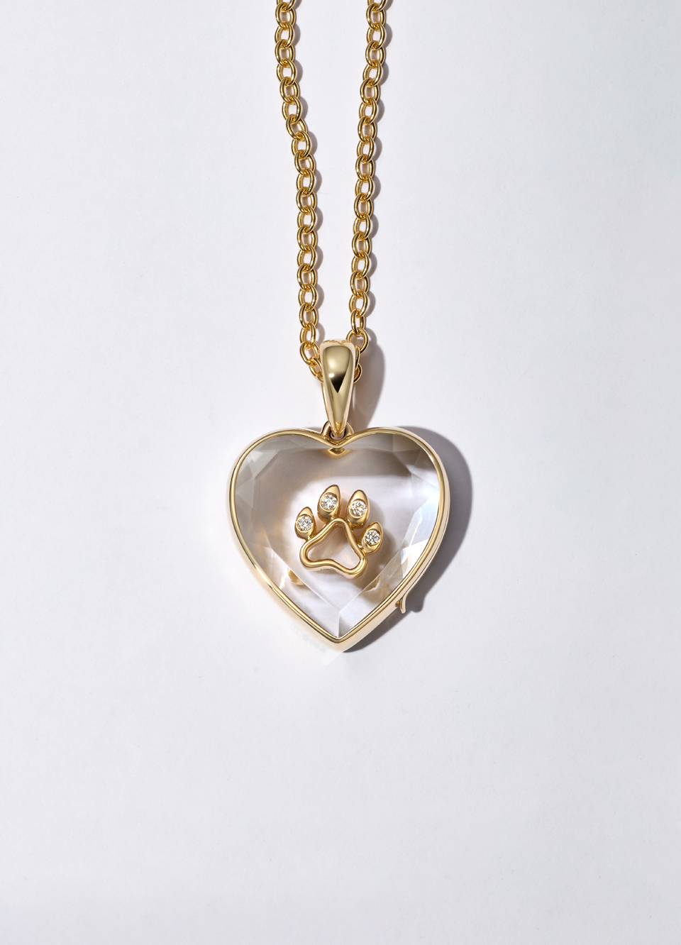 Our Midi Heart Locket handcrafted in 14k gold, curated with our Diamond Dog Paw charm.